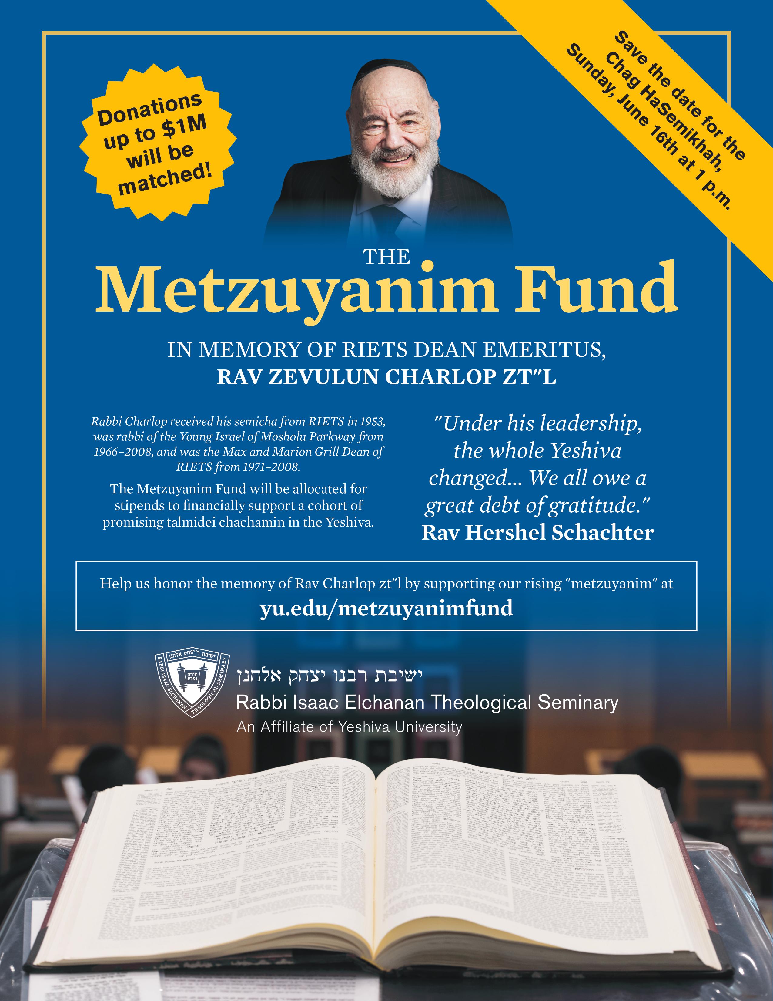 Our Dean Emeritus, Rabbi Zevulun Charlop Zt"l, was a pillar of the RIETS community for decades and aided countless talmidim (or, as he would say, "metzuyanim") on their path to becoming rabbanim. As we prepare to celebrate the Chag HaSemikhah, we are privileged to establish the Metzuyanim Fund in his memory to financially support a yearly cohort of promising talmidei chachamim learning in our kollel. Thanks to a generous donor, contributions will be matched up to $1 million! Please consider supporting our rising metzuyanim in order to continue the tradition of excellence and success in learning that Rabbi Charlop embodied. Donations can be made at https://ko.8xgi5.shop/MetzuyanimFund